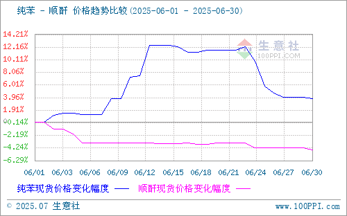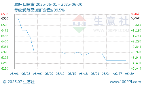 据生意社商品分析系统显示,6月份国内顺酐行情延续下行走势。截止6月30日顺酐报盘均价为6250.00元/吨(均含税),较6月1日的6550.00元/吨,下跌4.58%。
