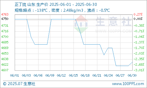 6月份国内正丁烷市场价格震荡回落,截止到6月30日山东价格在4600-4650元/吨左右。